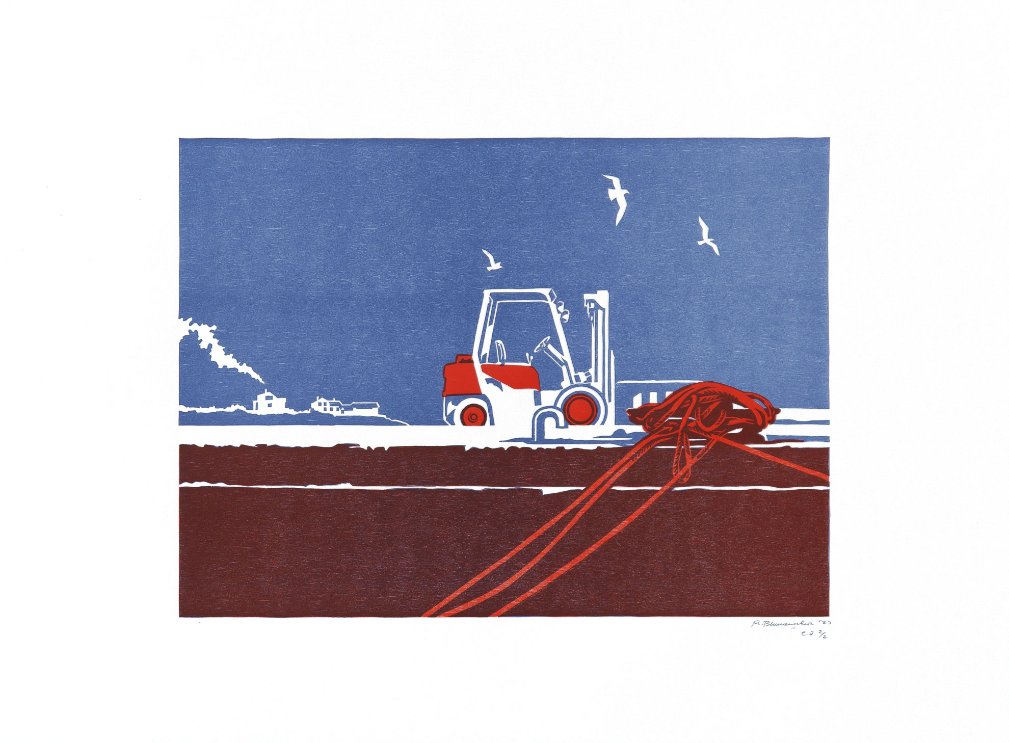 LKW, Zweifarbiger Holzschnitt 80 x 120 cm, gedruckt auf 250 gr/qm Hahnemühle, Auflage: 7 Drucke
