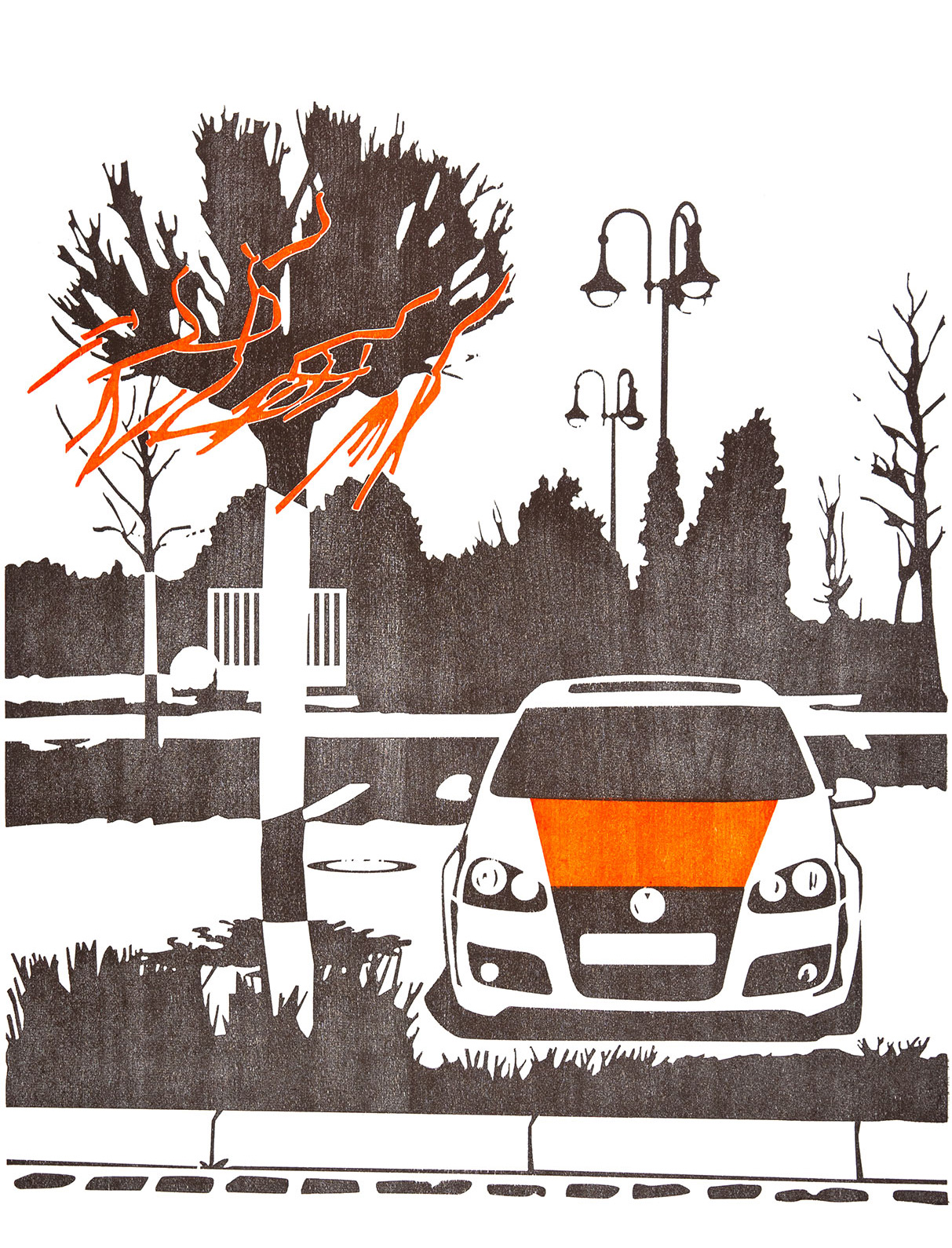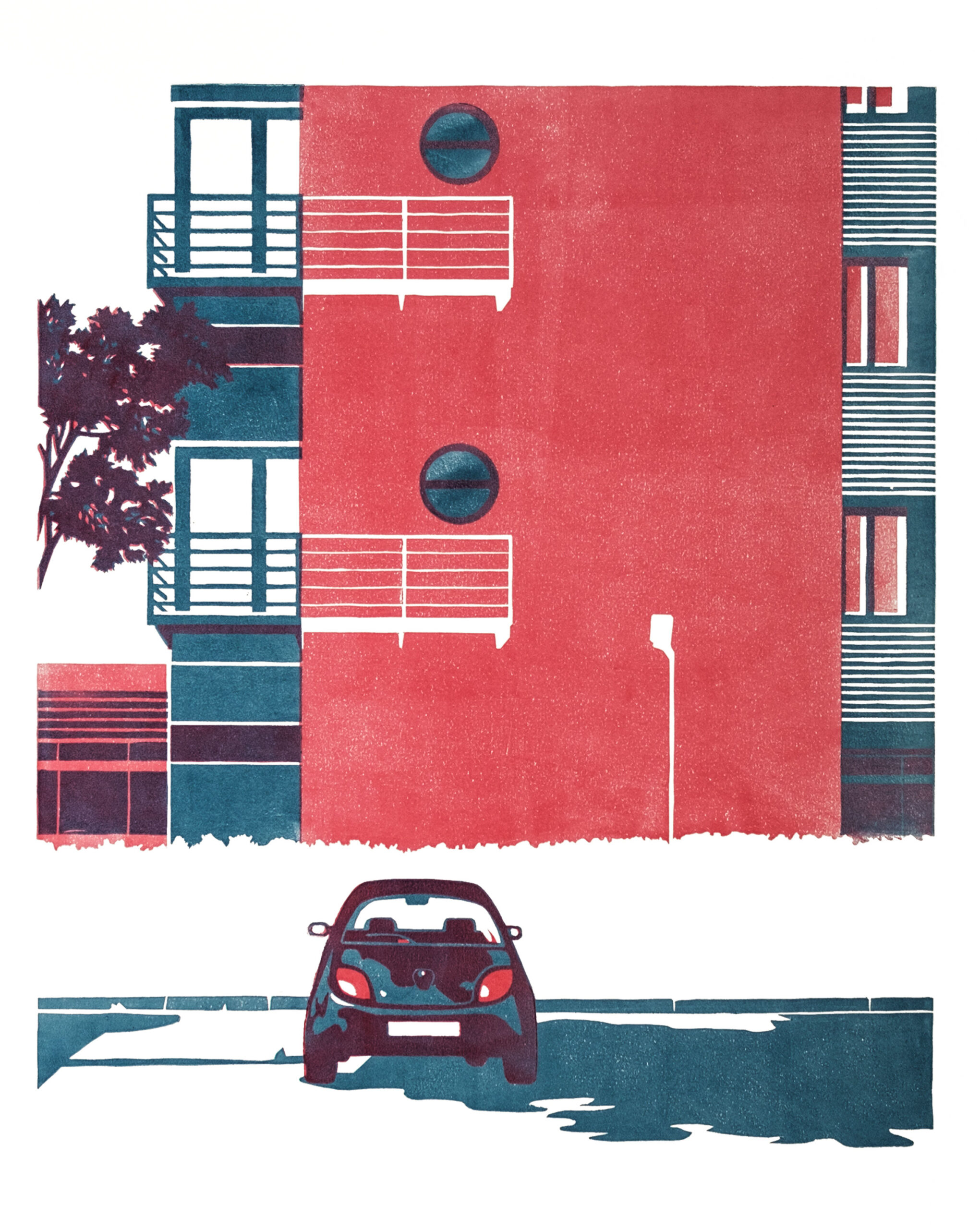 Ford Ka, Zweifarbiger Holzschnitt 70 x 100 cm, gedruckt auf 250 gr/qm Fabriano Unica weiss, Auflage: 14 Drucke