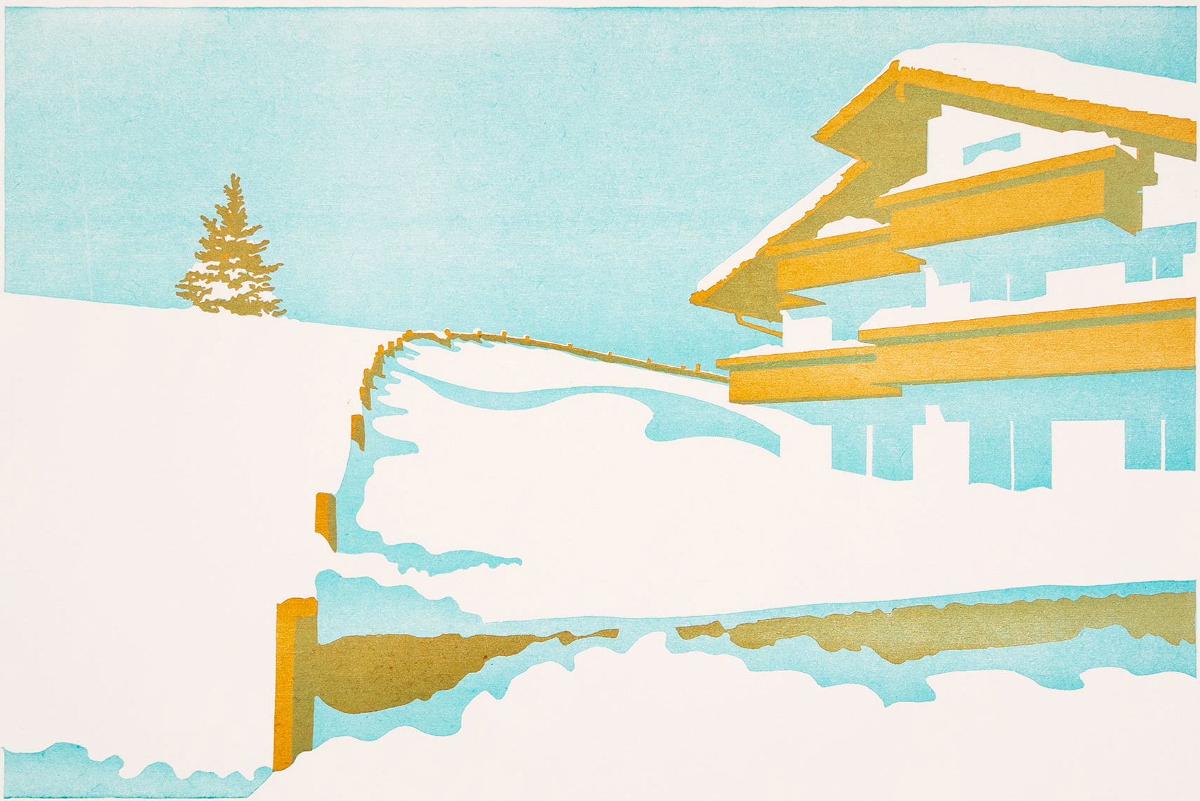 Winterhaus 2, Zweifarbiger Holzschnitt 100 x 70 cm, gedruckt auf 250 gr/qm Fabriano Unica weiss, Auflage: 14 Drucke
