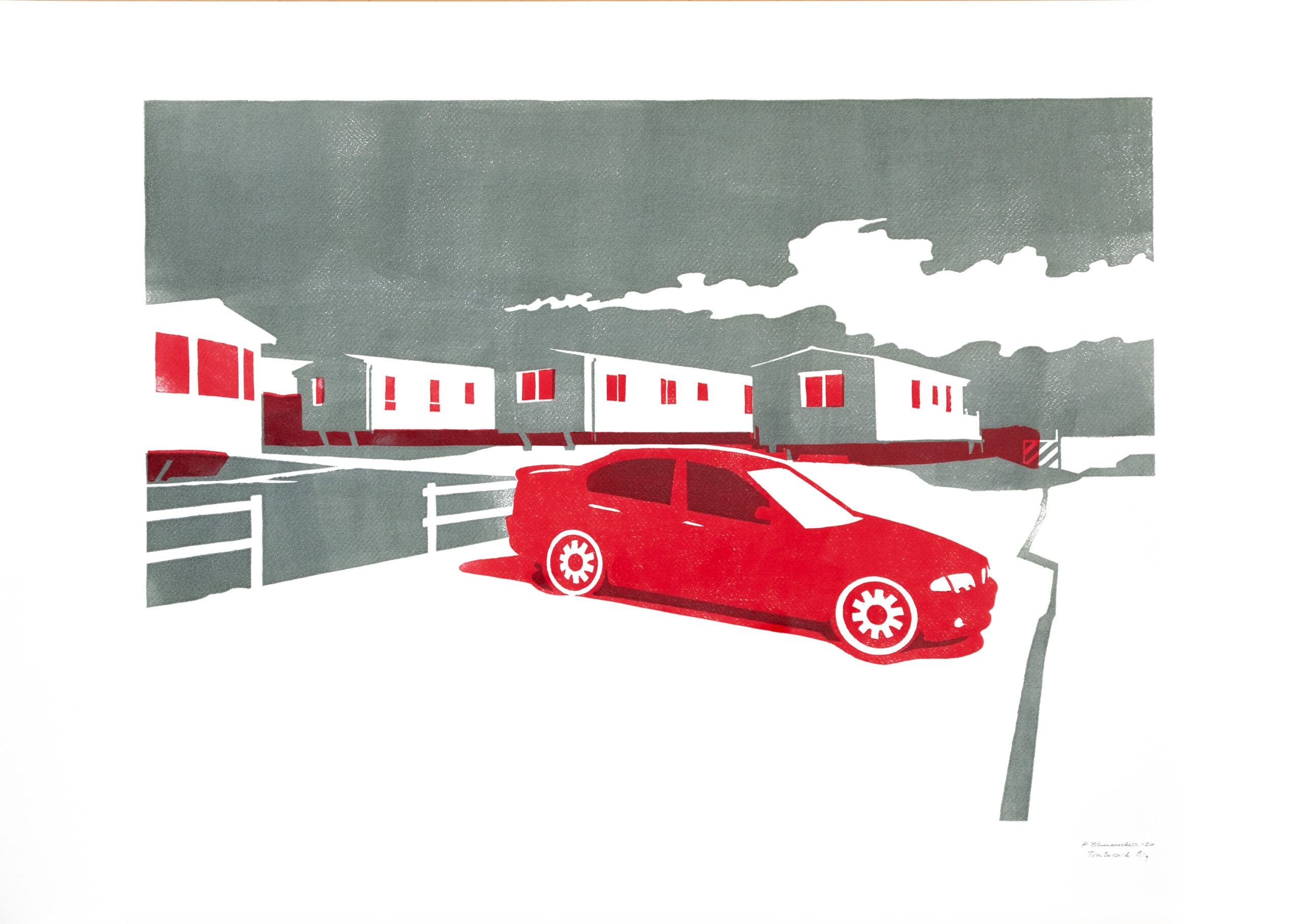 Trailer Park, Zweifarbiger Holzschnitt 90 x 70 cm, gedruckt auf 250 gr/qm Fedrigoni, Auflage: 10 Drucke